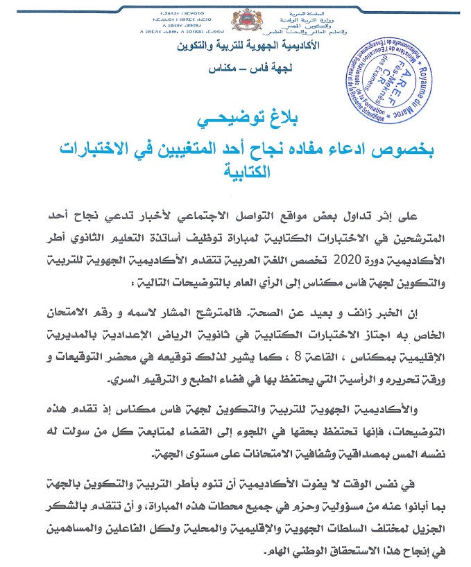بعد ادعاء بعض مواقع التواصل الاجتماعي نجاح أحد المترشحين في الاختبارات الكتابية لمباراة توظيف أساتذة التعليم الثانوي أطر الأكاديمية دورة 2020، تخصص اللغة العربية، وهو الأمر الذي دفع بأكاديمية التربية والتكوين بجهة فاس مكناس إلى تقديم التوضيحات التالية: