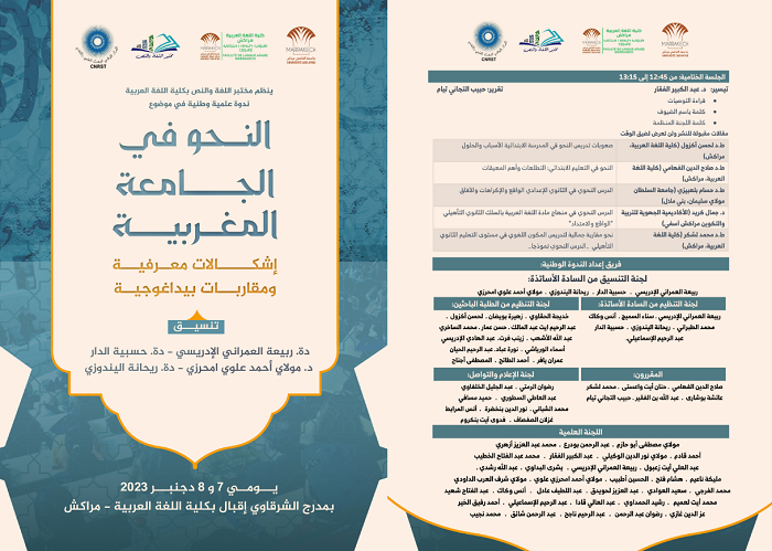 ينظم مختبر اللغة والنص بكلية اللغة العربية ندوة علمية وطنية في موضوع: النحو في الجامعة المغربية: إشكالات معرفية ومقاربات بيداغوجية من تنسيق: الدكتورة ربيعة العمراني الإدريسي والدكتورة حسبية الدار والدكتور مولاي أحمد علوي امحرزي والدكتورة ريحانة اليندوزي وذلك يومي: 7 و8 دجنبر 2023 بمدرج الشرقاوي إقبال بكلية اللغة العربية -مراكش-.