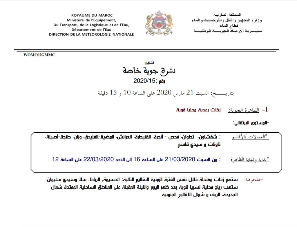 أكدت مديرية الأرصاد الجوية الوطنية، اليوم السبت، أن زخات رعدية محليا قوية مرتقبة بكل من عمالات شفشاون، تطوان، الفحص أنجرة، القنيطرة، العرائش، المضيق الفنيدق، وزان، طنجة أصيلة، تاونات وسيدي قاسم، وذلك من الساعة الرابعة من مساء يوم السبت إلى غاية زوال يوم غد الأحد.