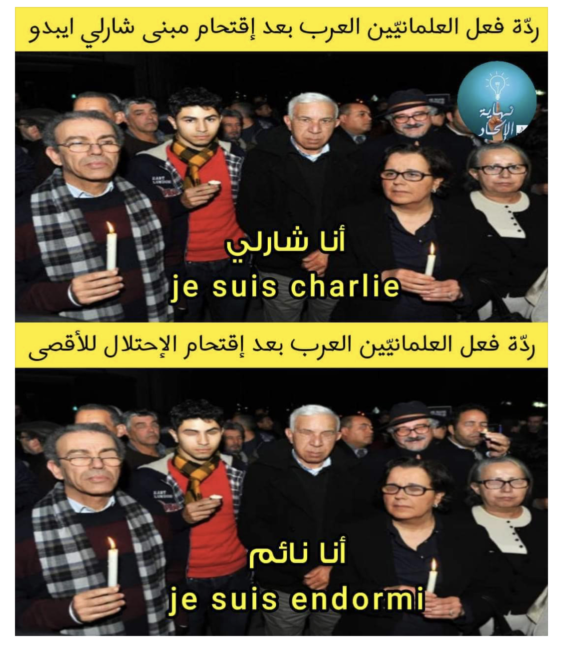 وتناقل النشطاء صورا لحقوقيين وصحافيين وفنانين وممثلين وكتاب ينتمون للفصيل العلماني، حين نظموا وقفة تضامنية مع قتلى المجلة الفرنسية «شارلي إيبدو»؛ وتضامنوا مع قتلى المجلة الساخرة بالدين الإسلامي والنبي محمد صلى الله عليه وسلم، وحملوا شموعا وأوراق كتب عليها «Je suis charlie».