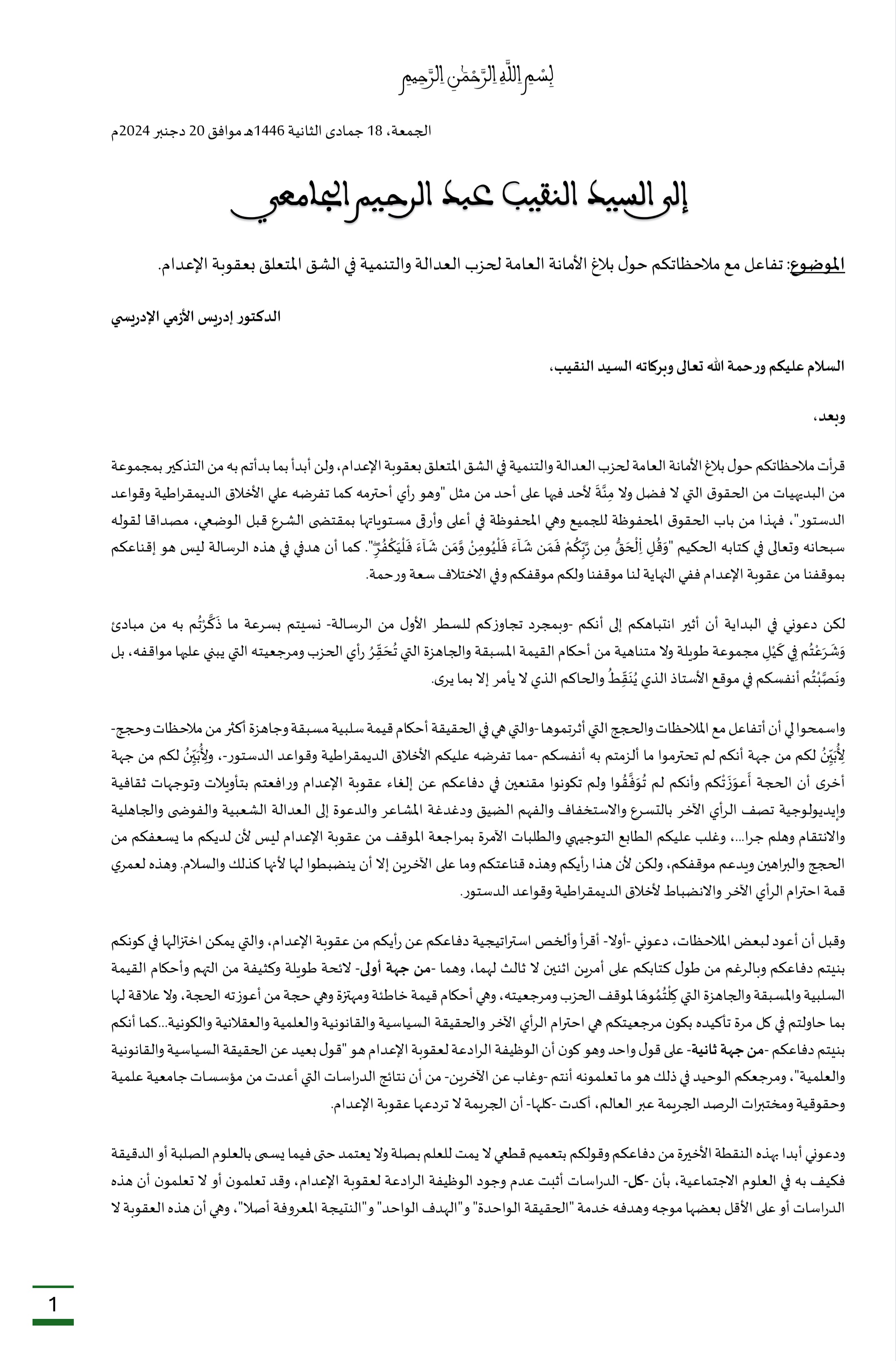وجه إدريس الأزمي الإدريسي، رئيس المجلس الوطني لحزب العدالة والتنمية، رسالة إلى النقيب عبد الرحيم الجامعي، تفاعلا مع الملاحظات التي أدلى بها حول بلاغ الأمانة العامة لحزب العدالة والتنمية في الشق المتعلق بعقوبة الإعدام.