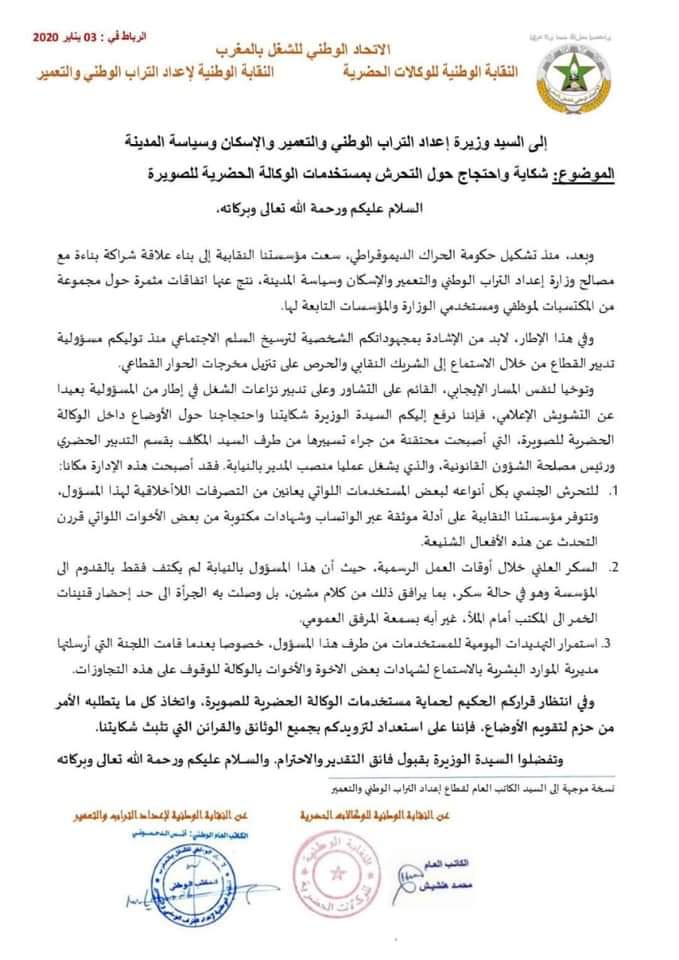 ورفعت النقابتان للوزيرة شكاية حول الأوضاع داخل الوكالة الحضرية للصويرة، التي أصبحت بسبب تصرف أحد المسؤولين، وفق قولهما، مكانا: