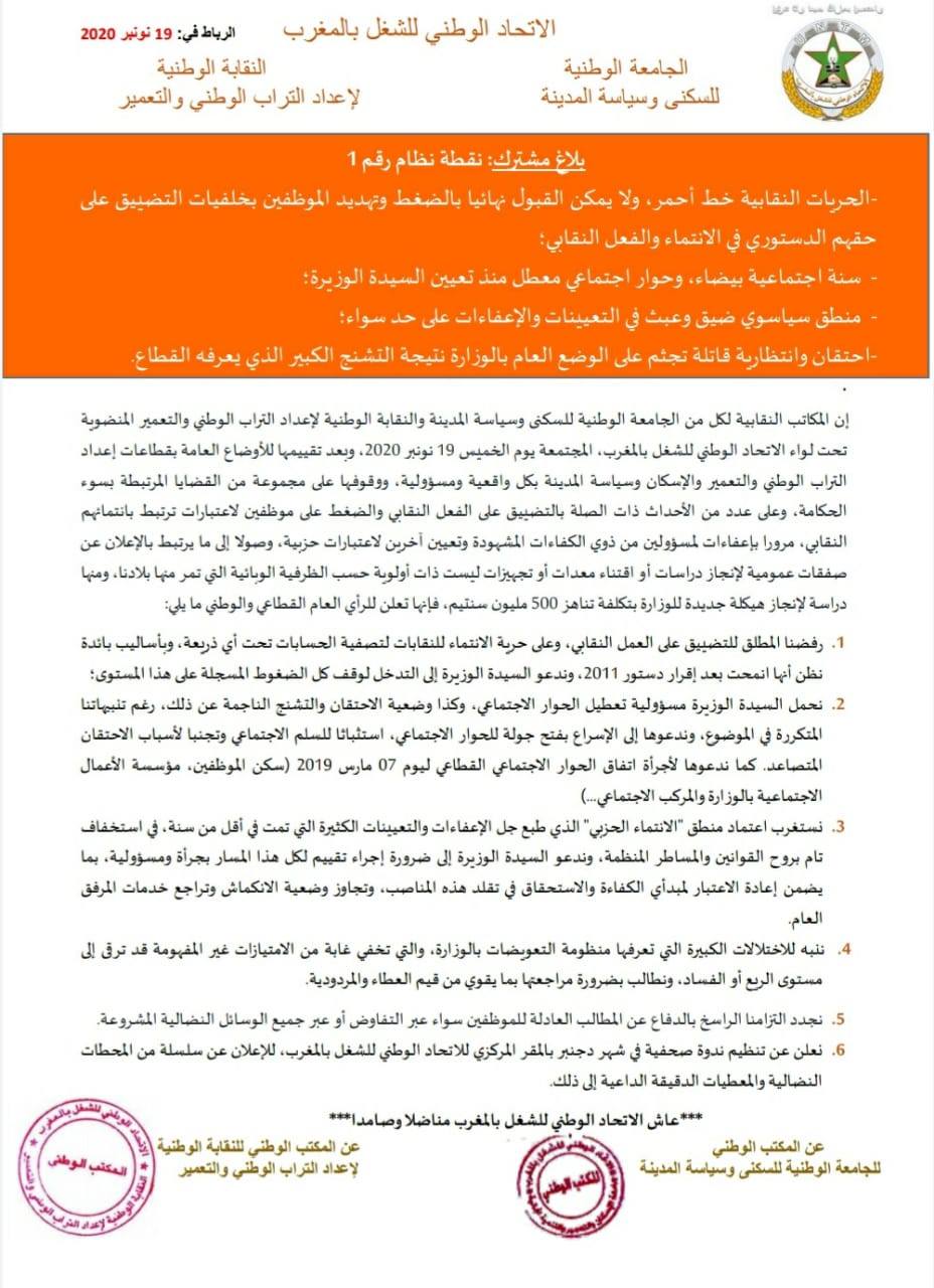 كما عبر ذات المصدر، عن رفضه “للتضييق على العمل النقابي، وعلى حرية الانتماء للنقابات لتصفية الحسابات تحت أي ذريعة، وبأساليب بائدة نظن أنها انمحت بعد إقرار دستور 2011″، محملا الوزارة مسؤولية “تعطيل الحوار الاجتماعي، وكذا وضعية الاحتقان والتشنج الناجمة عن ذلك”، رغم التنبيه المتكرر في الموضوع، داعيا، إلى الإسراع بفتح جولة للحوار الاجتماعي، استثباثا للسلم الاجتماعي وتجنبا لأسباب الاحتقان المتصاعد. مع أجرأة اتفاق الحوار الاجتماعي القطاعي ليوم 07 مارس 2019 (سكن الموظفين، مؤسسة الأعمال الاجتماعية بالوزارة والمركب الاجتماعي.
