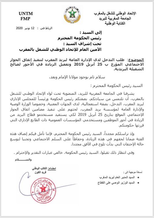 راسلت الجامعة المغربية للبريد، التابعة للاتحاد الوطني للشغل بالمغرب، رئيس الحكومة، سعد الدين العثماني، للتدخل لدى الإدارة العامة لبريد المغرب، لتنفيذ اتفاق الحوار الاجتماعي المؤرخ ب25 أبريل 2019، وتفعيل الزيادة في الأجور لصالح الشغيلة البريدية.