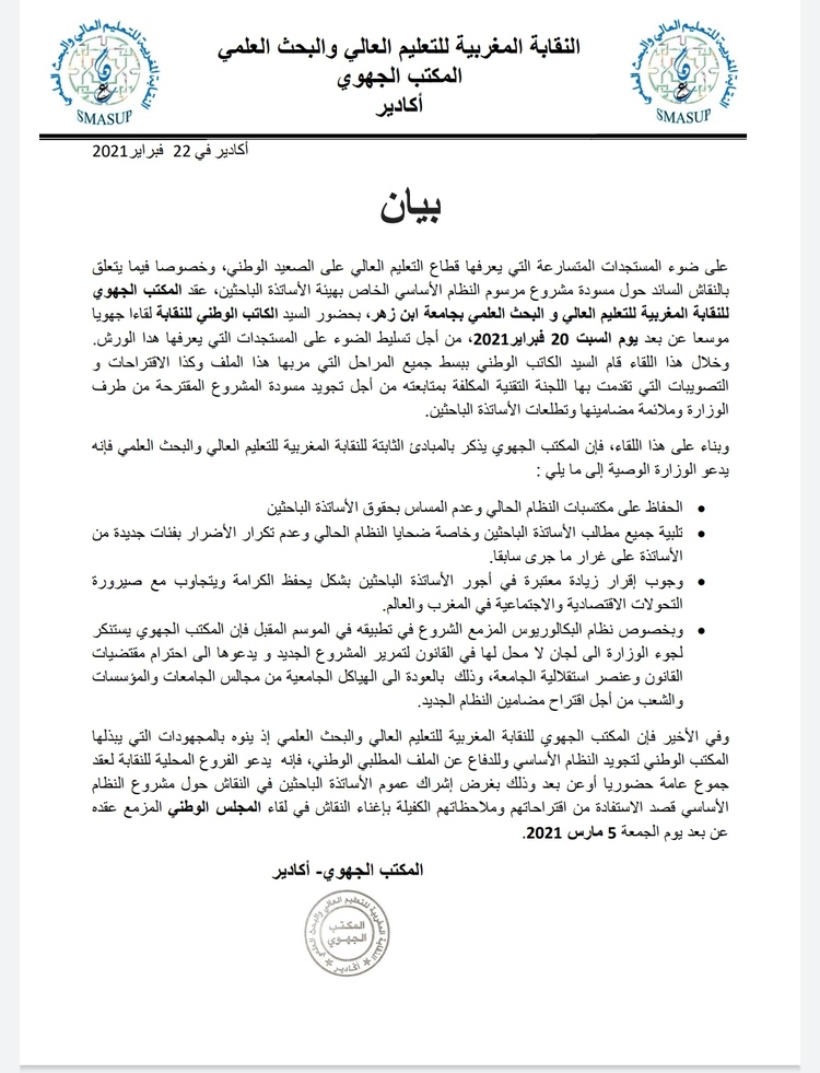 وأكدت النقابة على وجوب استجابة الوزارة لمطالب الاساتذة الباحثين، خاصة ضحايا النظام الحالي.