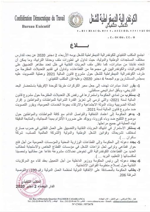 واستغربت الكونفدرالية في بلاغ لها، تمادي الحكومة واستمرارها في رفض كل التعديلات المقترحة حول مشروع قانون المالية لسنة 2021، مشيرة أن هذه المقترحات ترمي إلى تعزيز القدرة الشرائية للمواطنات والمواطنين، وإقرار العدالة الضريبية وبناء الدولة الاجتماعية والارتقاء بجودة الخدمات العمومية، مؤكدة تصويتها ضد المشروع.