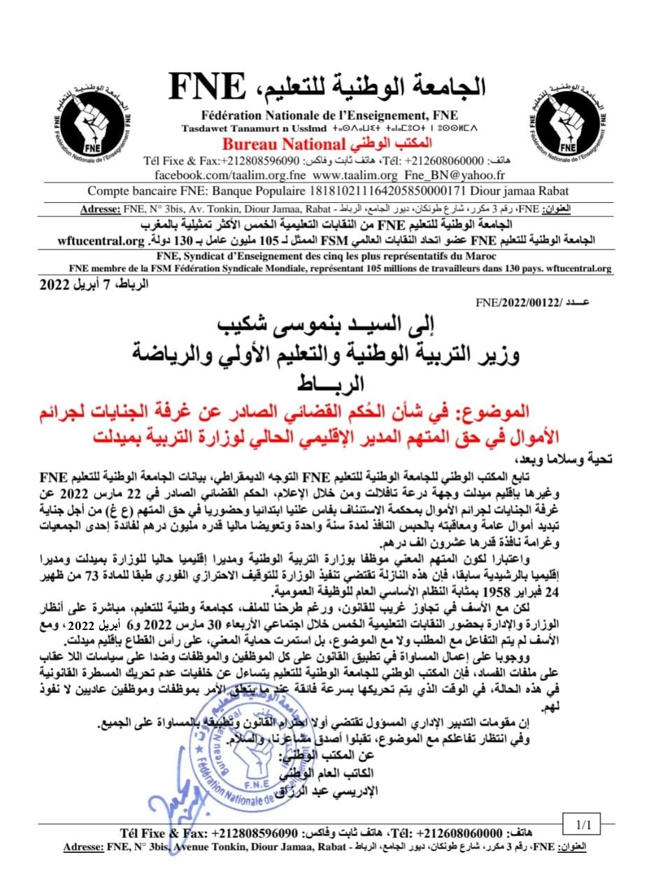 وجهت الجامعة الوطنية للتعليم FNE رسالة لشكيب بنموسى وزير التربية الوطنية والتعليم الأولي والرياضة، تساءلت فيها عن الحُكم القضائي الصادر عن غرفة الجنايات لجرائم الأموال في حق المتهم المدير الإقليمي الحالي لوزارة التربية بميدلت.