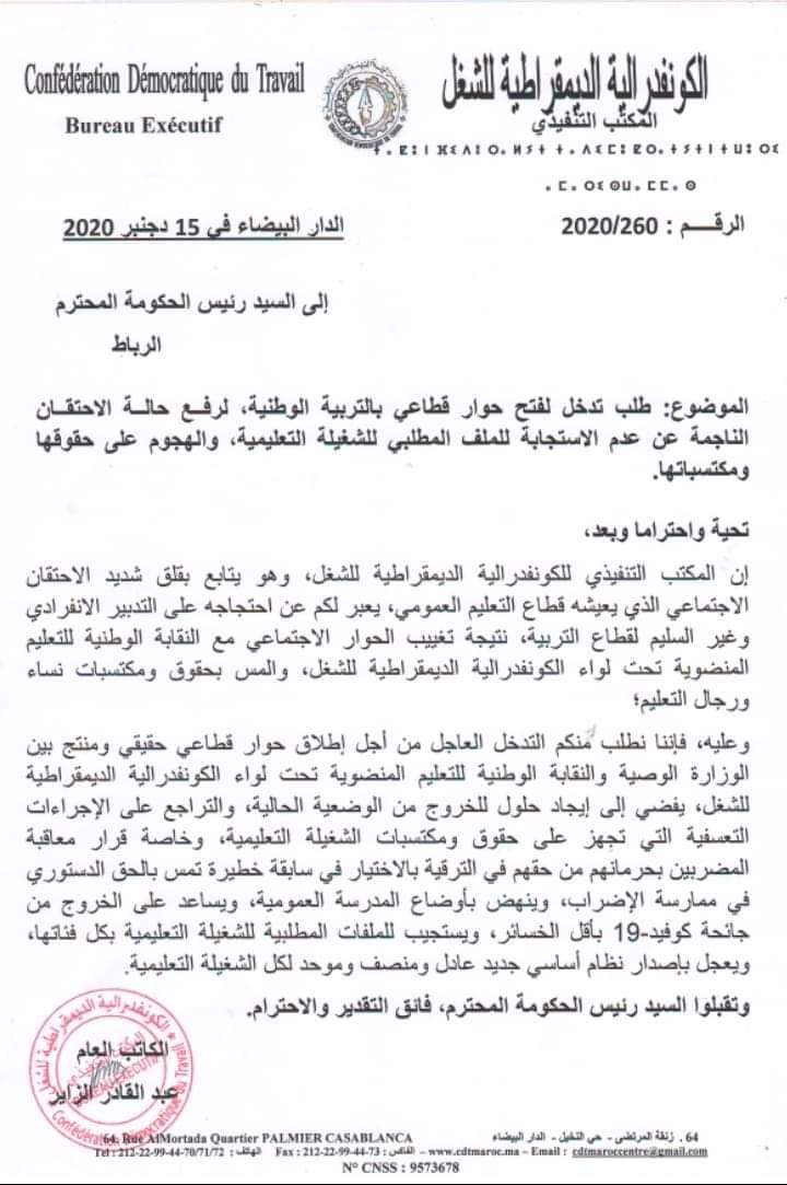 راسلت الكونفدرالية الديمقراطية للشغل، رئيس الحكومة، سعد الدين العثماني، محذرة من الاحتقان الذين أصبح يعيشه قطاع التربية الوطنية.