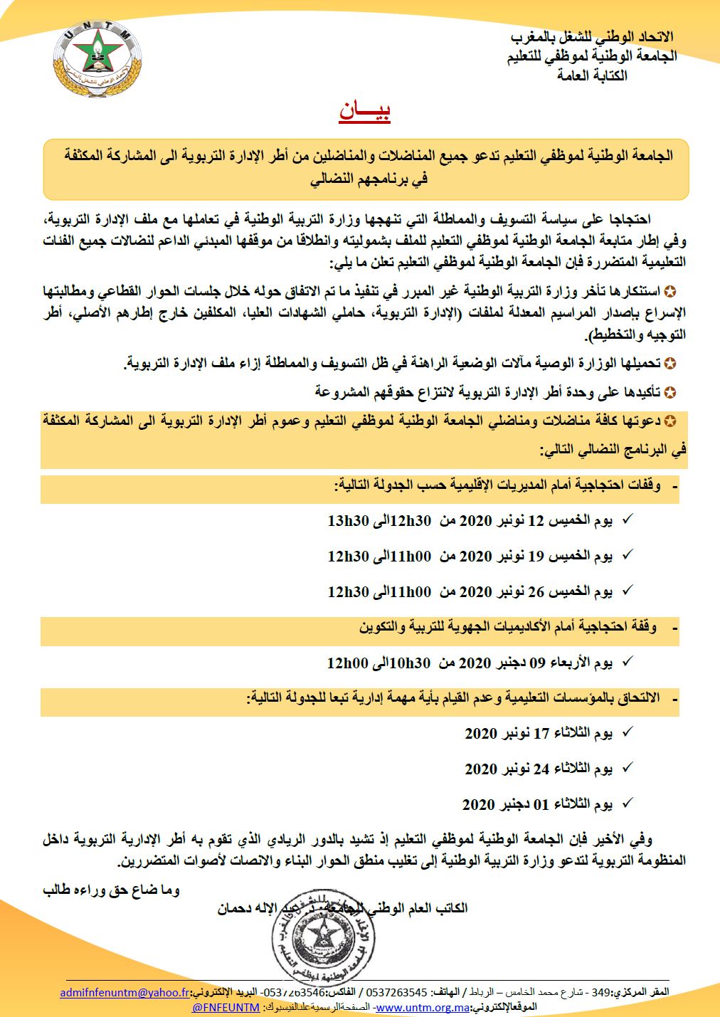 وحمل الإطار النقابي “الوزارة الوصية مآلات الوضعية الراهنة في ظل التسويف والمماطلة إزاء ملف الإدارة التربوية”. مؤكدا، على وحدة أطر الإدارة التربوية لانتزاع حقوقهم المشروعة.