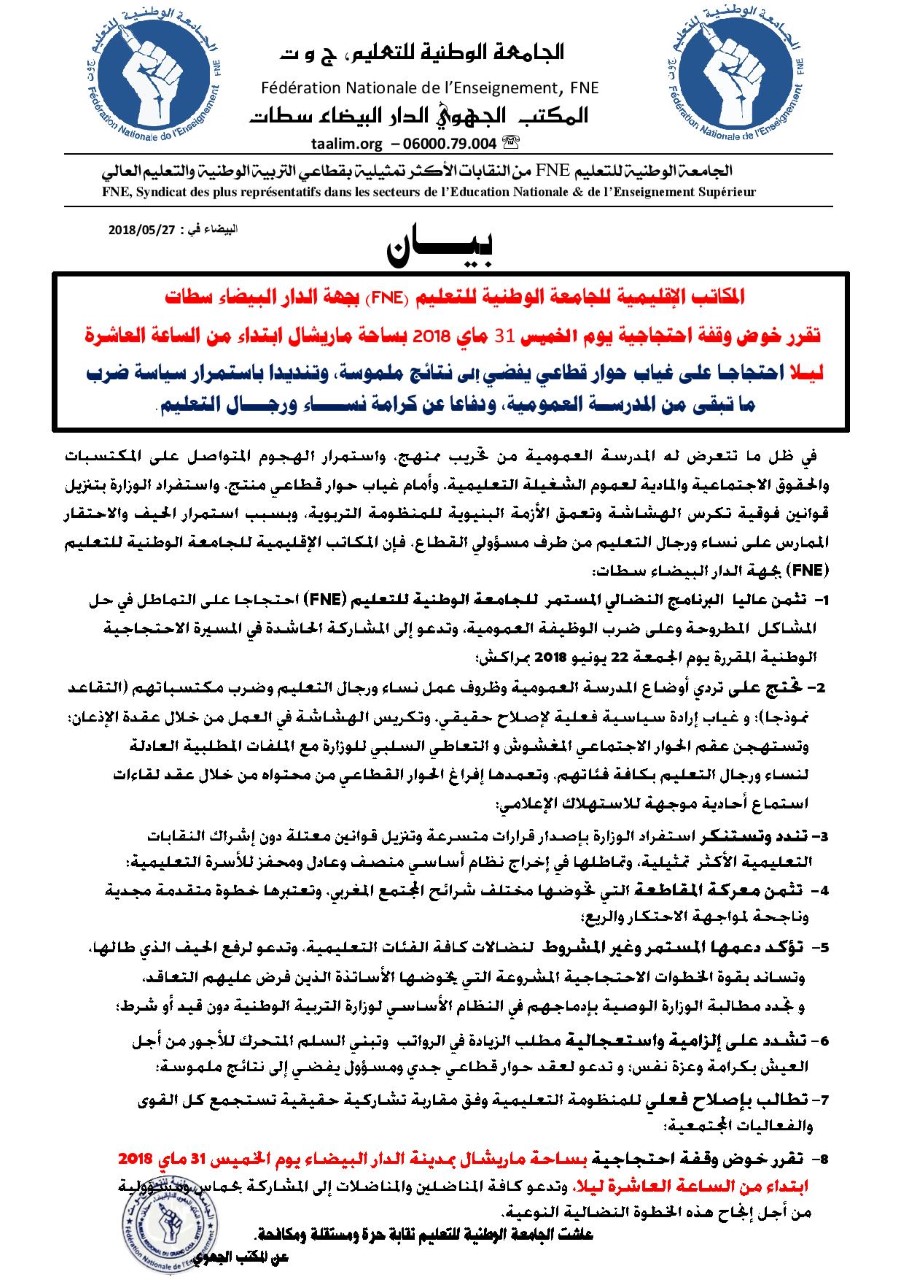 1- تثمن عاليا البرنامج النضالي المستمر للجامعة الوطنية للتعليم (FNE) احتجاجا على التماطل في حل المشاكل المطروحة وعلى ضرب الوظيفة العمومية، وتدعو إلى المشاركة الحاشدة في المسيرة الاحتجاجية الوطنية المقررة يوم الجمعة 22 يونيو 2018 بمراكش؛