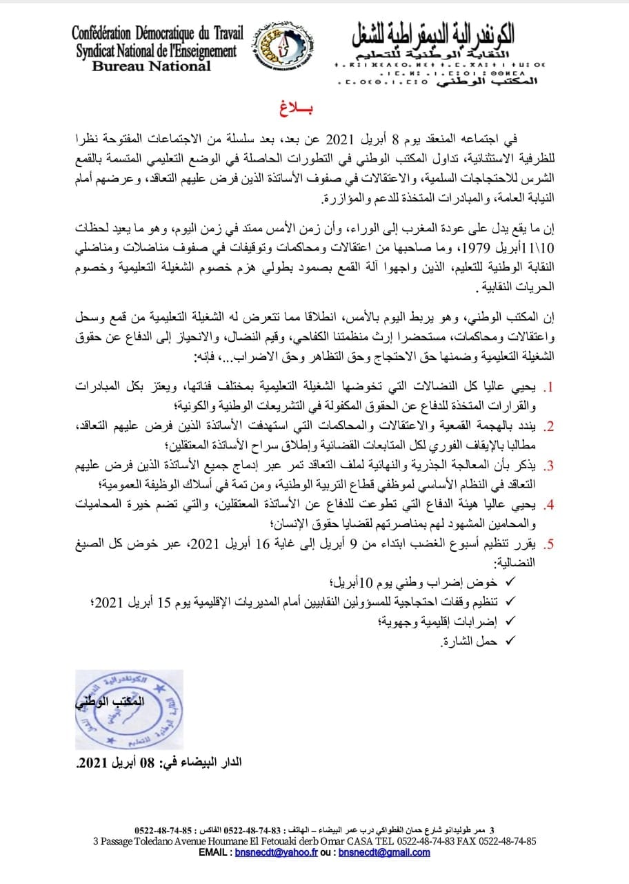 وقرّرت النقابة تنظيم أسبوع الغضب ابتداء من 9 أبريل إلى غاية 16 أبريل 2021، عبر خوض مجموعة من الأشكال الاحتجاجية، خوض إضراب وطني يوم 10أبريل، تنظيم وقفات احتجاجية للمسؤولين النقابيين أمام المديريات الإقليمية يوم 15 أبريل 2021، إضرابات إقليمية وجهوية، معحمل الشارة”.