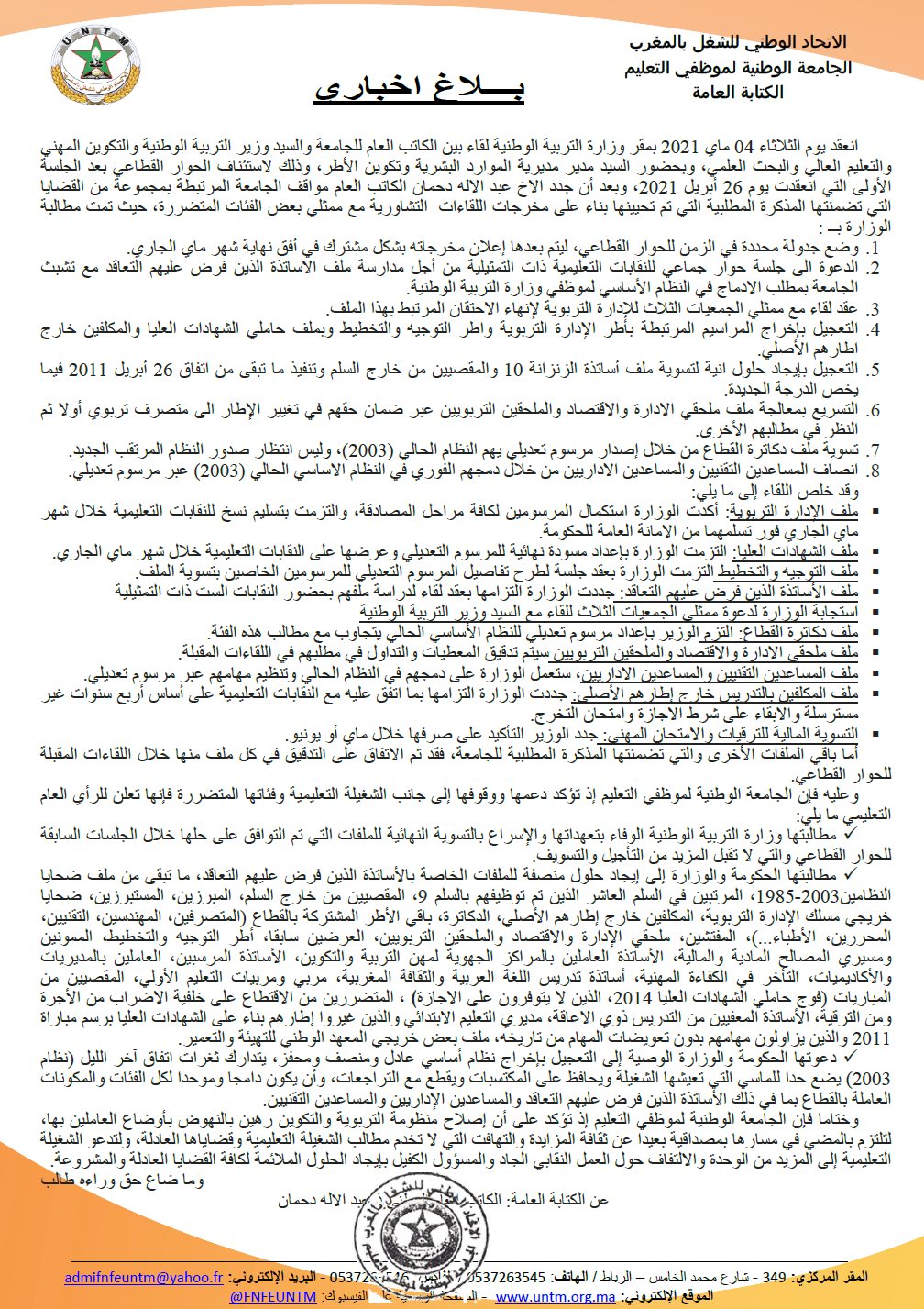 جاء ذلك، في بلاغ للكتابة الوطنية للنقابة ذاتها، عقب لقاء كاتبها الوطني عبد الاله دحمان، مع وزارة التربية الوطنية في الجولة الثانية من الحوار القطاعي، تعهدات الوزارة.