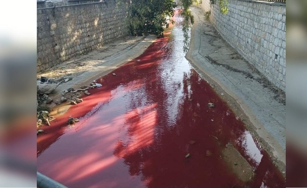 أثار تحول لون المياه في أحد الأنهار بمدينة برمنغهام البريطانية إلى اللون الأحمر الدموي، القلق لسكان المنطقة.