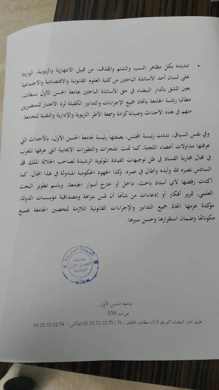 هذا وندد المصدر ذاته، بكل مظاهر السب والشتم والقذف، الواردة على لسان أحد الأساتذة الباحثين من كلية الحقوق بعين الشق بالدار البيضاء، في حق الأساتذة الباحثين بجامعة الحسن الأول.