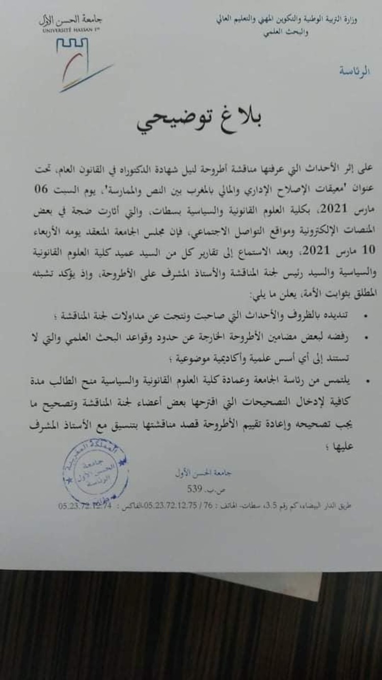 هذا أول تعليق لرئاسة جامعة سطات بخصوص أحداث مناقشة رسالة الدكتوراه..