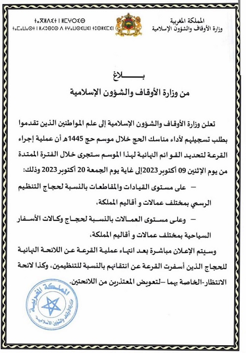 أعلنت وزارة الأوقاف والشؤون الإسلامية إلى عموم المواطنين الذين تقدموا بطلب تسجيلهم لأداء مناسك الحج خلال موسم حج 1445هـ أن عملية إجراء القرعة لتحديد القوائم النهائية لهذا الموسم ستجرى خلال الفترة الممتدة من يوم الاثنين 09 أكتوبر 2023 إلى غاية يوم الجمعة 20 أكتوبر 2023، وذلك: