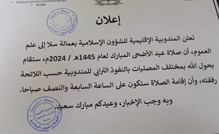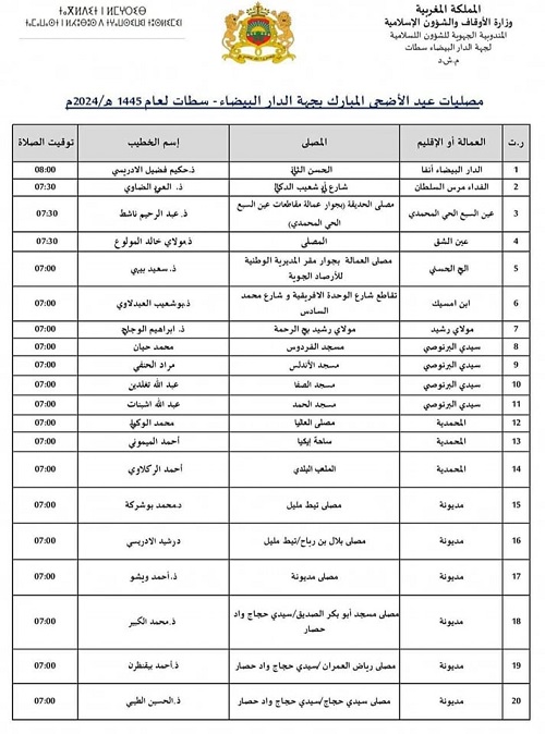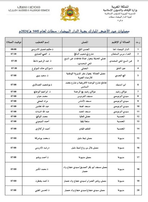 – توقيت صلاة عيد الأضحى سنة 1445هـ/2024م بجهة الدار البيضاء سطات ما بين 7:00 و7:30 و8:00 حسب اللائحة: