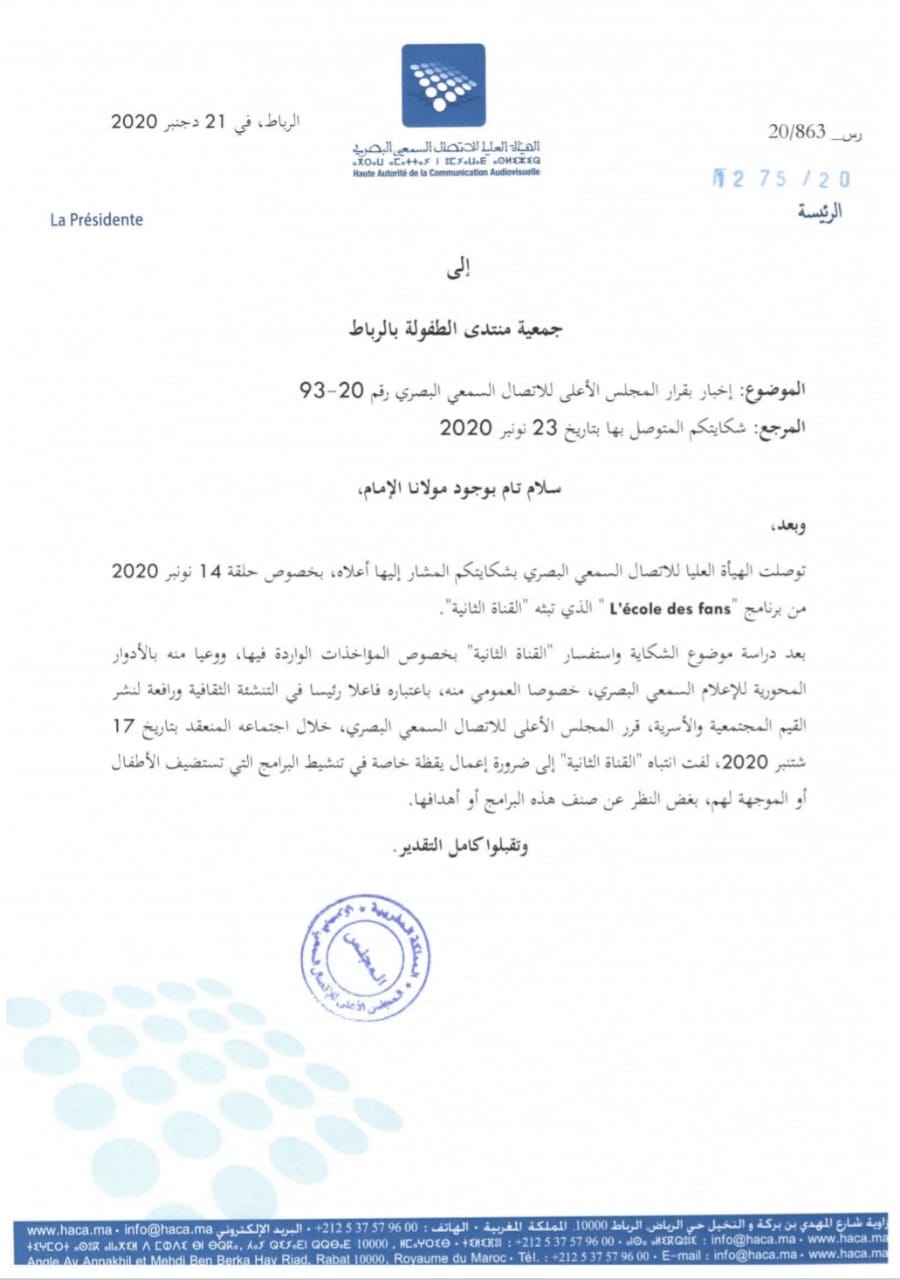 توصلت جمعية منتدى الطفولة برد المجلس الأعلى للاتصال السمعي البصري (الهاكا)، بخصوص شكاية كانت تقدمت بها الجمعية استنكارا لما تبثه القناة الثانية في برنامج L’école de fans من مضامين لا تناسب الهوية المغربية الواجب تلقينها للأطفال في تنشئتهم.