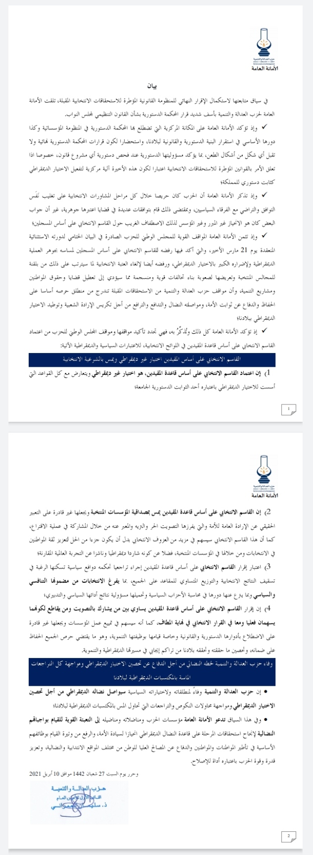وقالت الأمانة العامة، في بلاغ لها، أن اعتماد القاسم الانتخابي على أساس قاعدة المقيدين، هو اختيار غير ديمقراطي ويتعارض مع كل القواعد التي أسست للاختيار الديمقراطي باعتباره أحد الثوابت الدستورية الجامعة.
