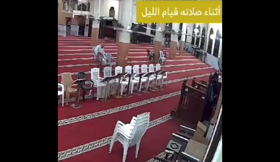 ويظهر الحاج أبو هيثم، وفق ما تظهره لقطات صورتها كاميرا مراقبة مثبتة بالمسجد، وهو يدخل إلى المسجد قبل أذان الفجر، حيث قام برفع أذان الفجر الأول، ثم صلى قيام الليل.