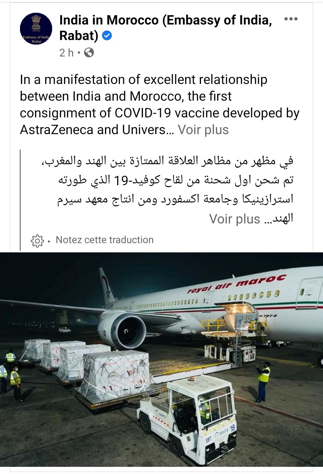 قالت سفارة الهند بالمغرب أن مظهر شحن أول شحنة من لقاح كورونا من مطار بومباي الدولي في اتجاه المغرب، من مظاهر العلاقات الممتازة بين المغرب والهند.