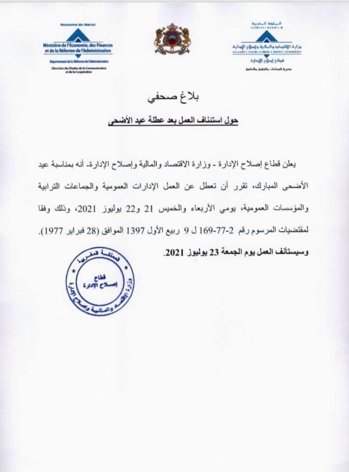 أعلنت وزارة الاقتصاد والمالية وإصلاح الإدارة، اليوم الأحد، عن تعطل العمل بالإدارات العمومية والجماعات الترابية والمؤسسات العمومية، وذلك بمناسبة عيد الأضحى.