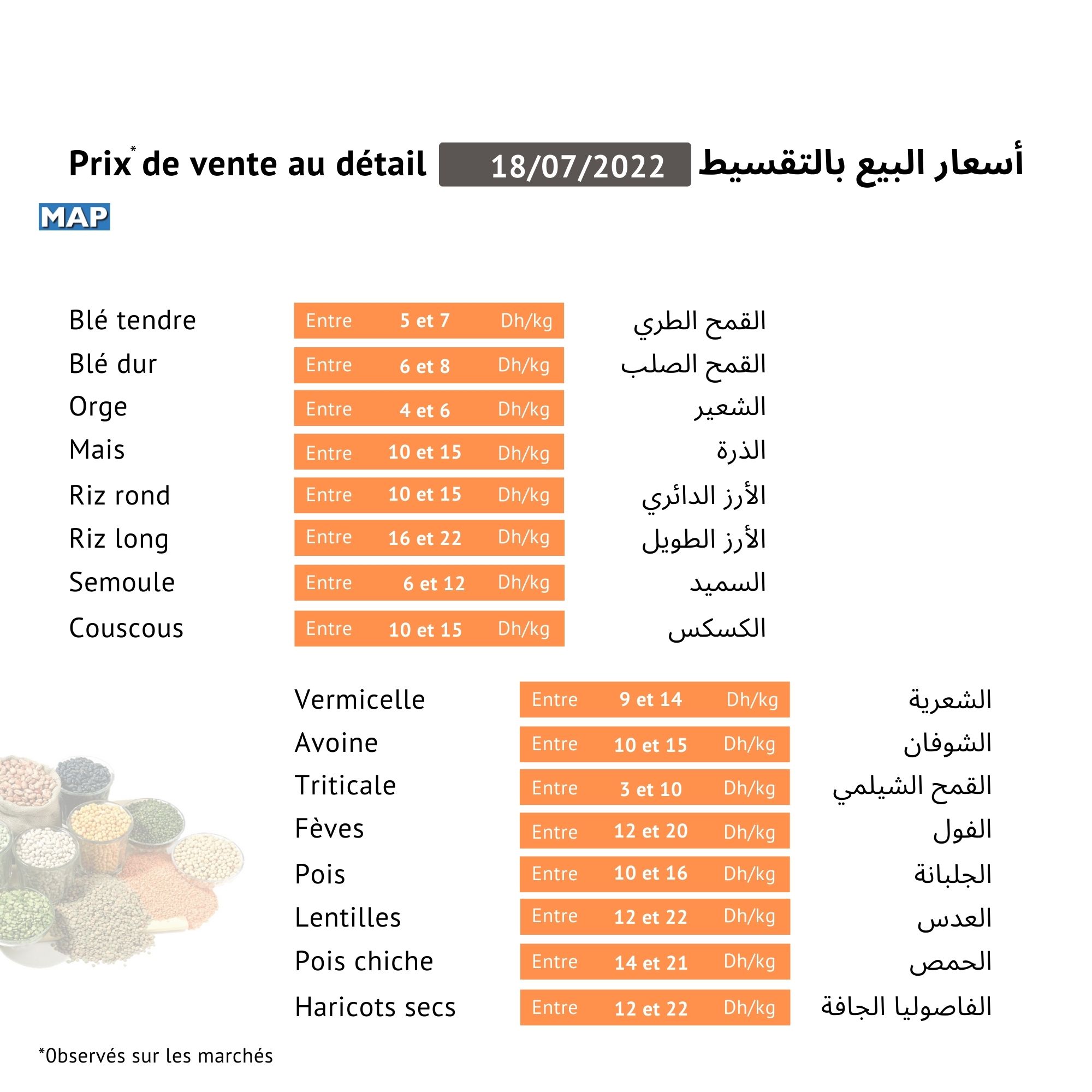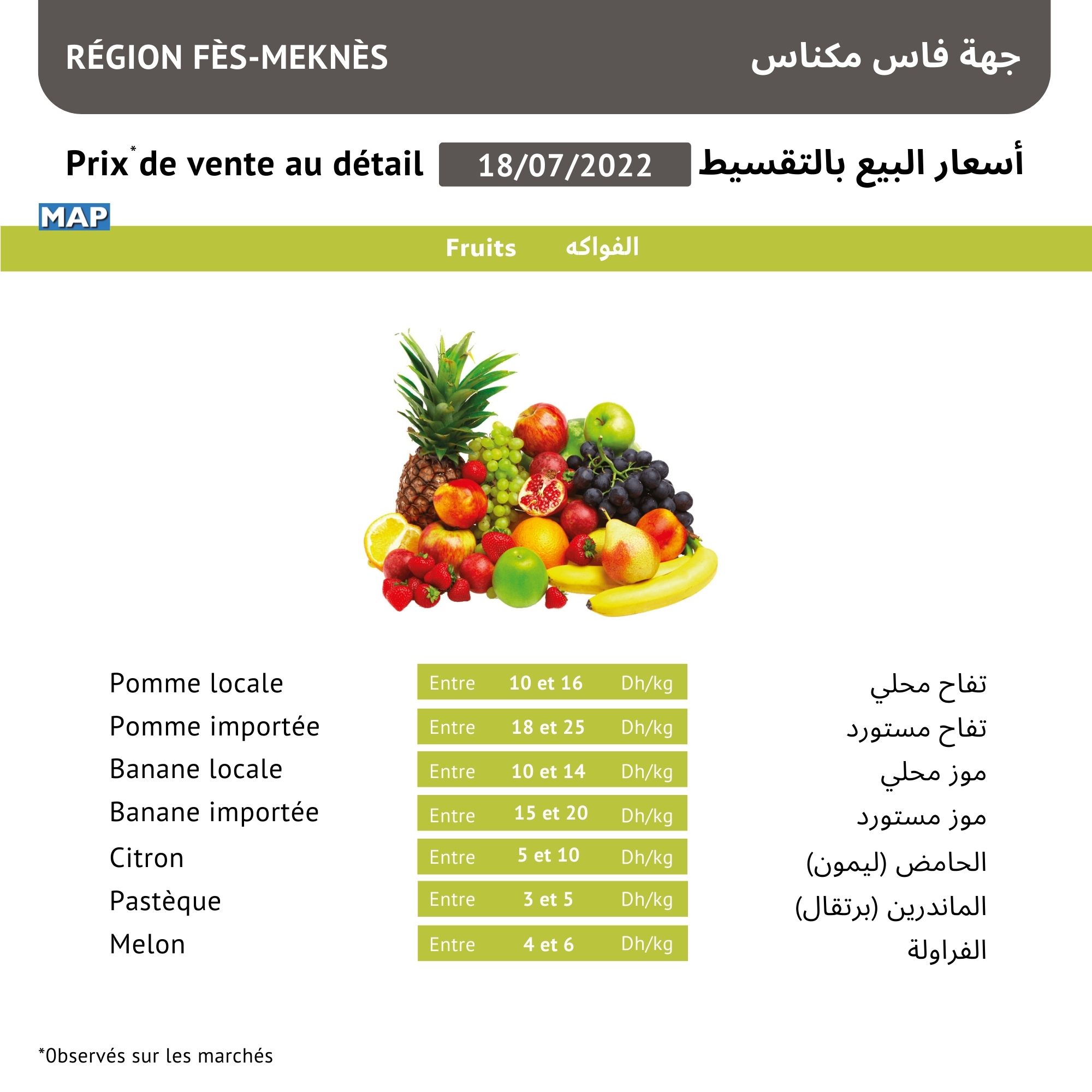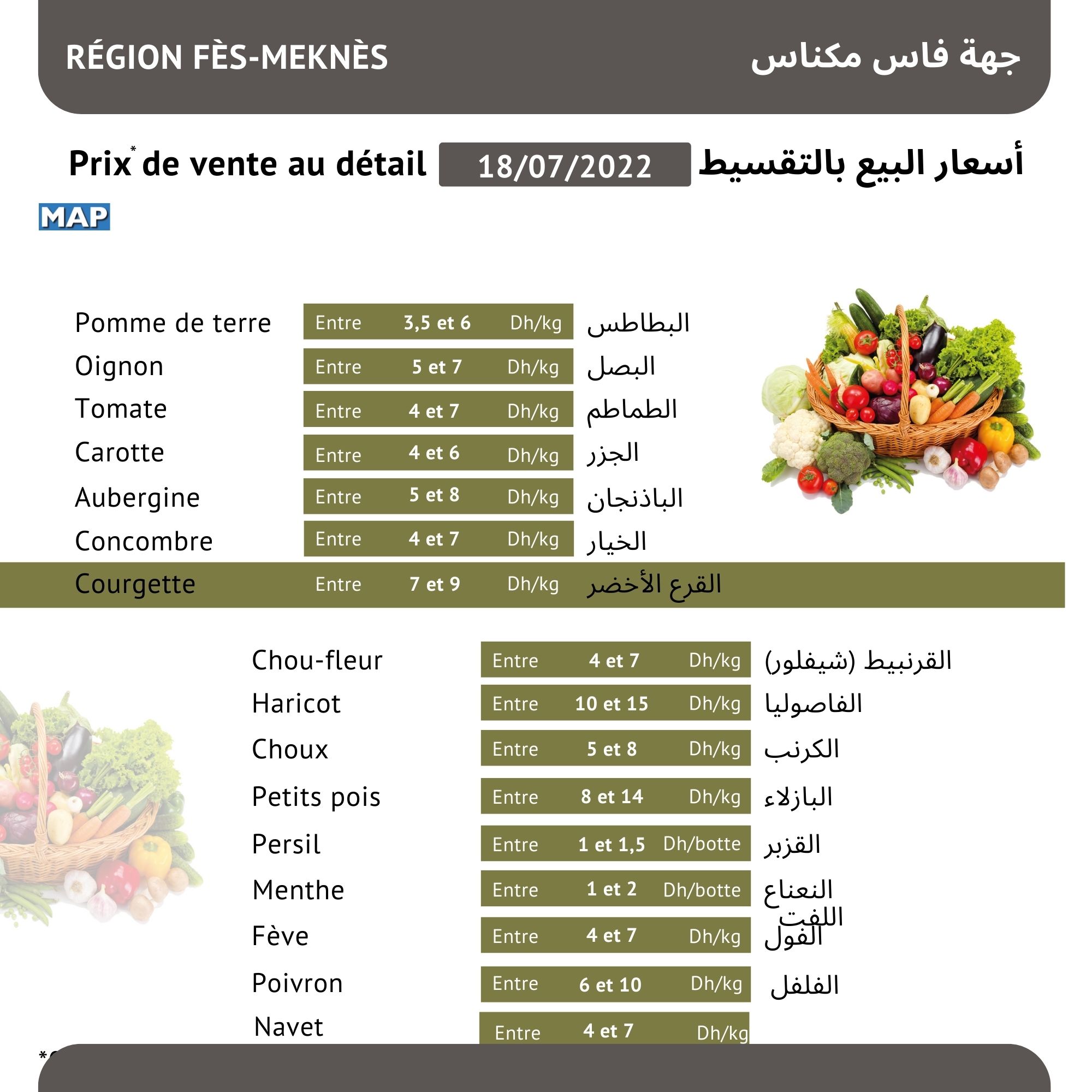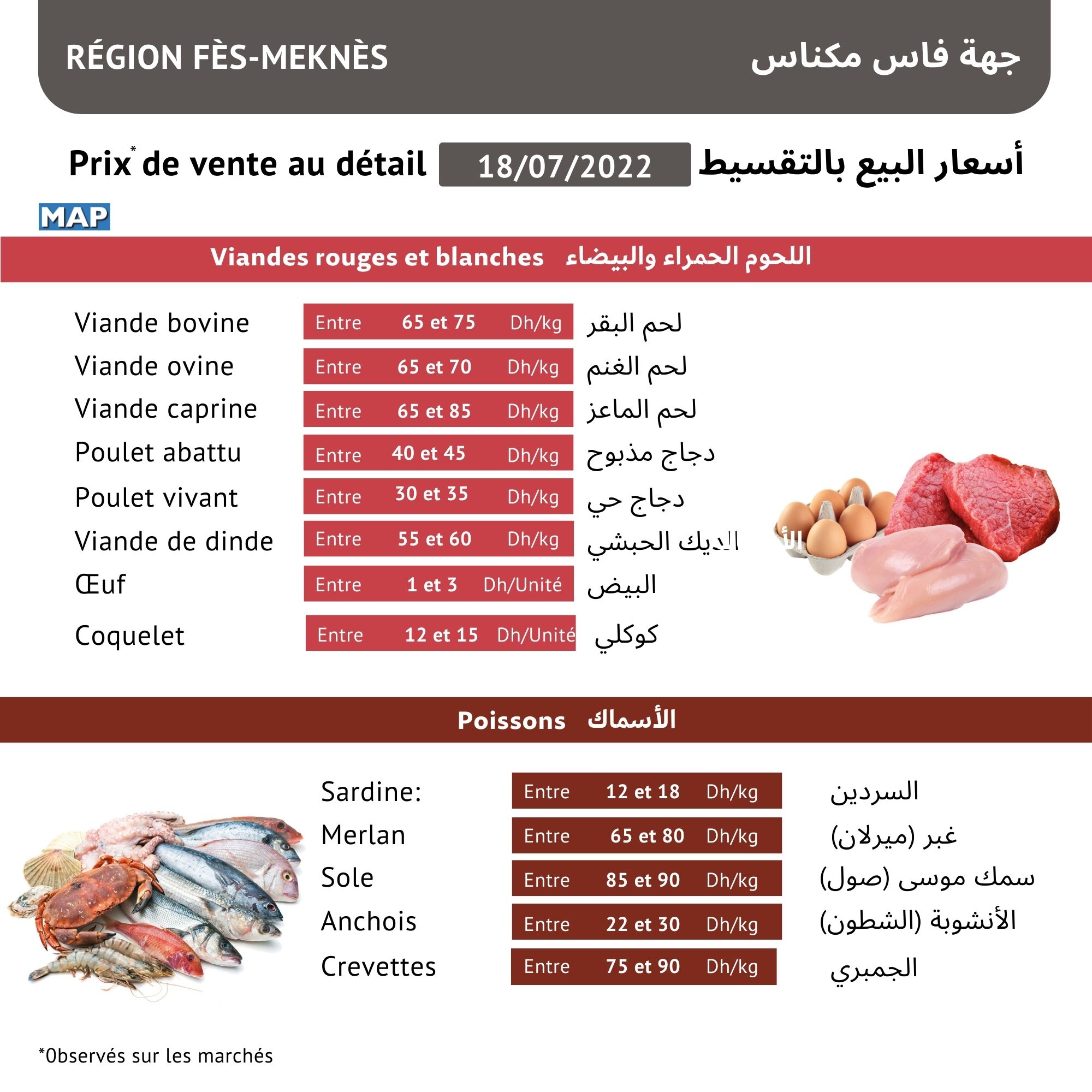 في ما يلي أسعار بيع المواد الغذائية الأساسية بالتقسيط كما تمت معاينتها، اليوم الاثنين بأسواق جهة فاس-مكناس، وفق ما أوردته وكالة المغرب العربي للأنباء: