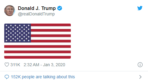 الرئيس الأمريكي لم يكتب أية كلمة في التغريدة، لكنه نشر فيها صورة لعلم الولايات المتحدة، في إشارة منه إلى احتفاء بلاده بقتل سليماني، الذي تتهمه واشنطن بلعب دور كبير في استهداف القوات الأمريكية بالعراق، وفي الأحداث الأخيرة التي شهدت مهاجمة سفارة واشنطن في بغداد.