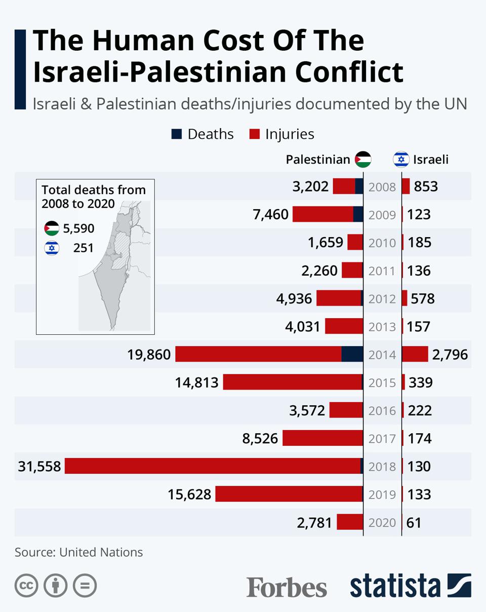 أفادت معطيات نشرها مكتب الأمم المتحدة لتنسيق الشؤون الإنسانية (OCHA)، أن حصيلة العدوان الصهيوني على الشعب الفلسطيني “جد ثقيلة”، إذ توفي حوالي 5،600 فلسطيني بين عامي 2008 و 2020 بينما أصيب ما يقرب من 115،000. وخلال الفترة نفسها.