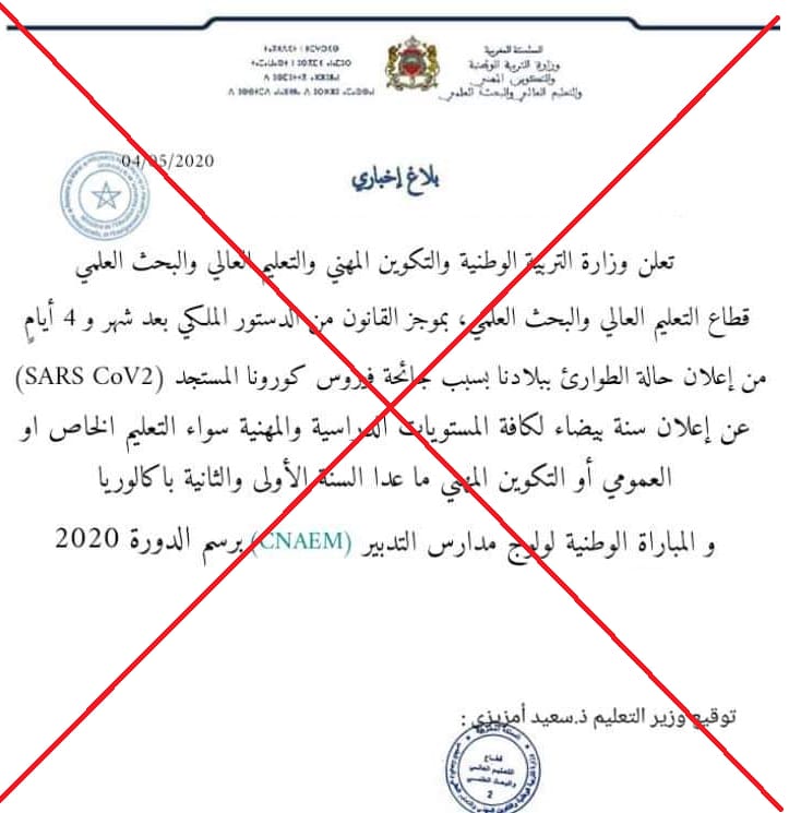 على إثر تداول بعض الأشخاص بمواقع التواصل الاجتماعي لبلاغ مفبرك يزعم من خلاله مروجوه أن وزارة التربية الوطنية والتكوين المهني والتعليم العالي والبحث العلمي، قد قررت “الاعلان عن سنة بيضاء بالنسبة لكافة المستويات مع استثناء البعض منها”، فإن الوزارة تنفي نفيا قاطعا ماجاء في هذا البلاغ من مغالطات ومعطيات مجانبة للصواب.