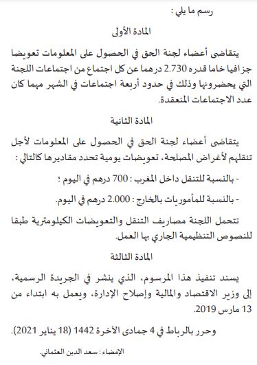 وأورد المرسوم في مادته الأولى، أن أعضاء لجنة الحق في الحصول على المعلومات يتقاضون تعويضا جزافيا خاص قدره 2730 درهما عن كل اجتماع من اجتماعات اللجنة التي يحضرونها وذلك في حدود 4 اجتماعات في الشهر.