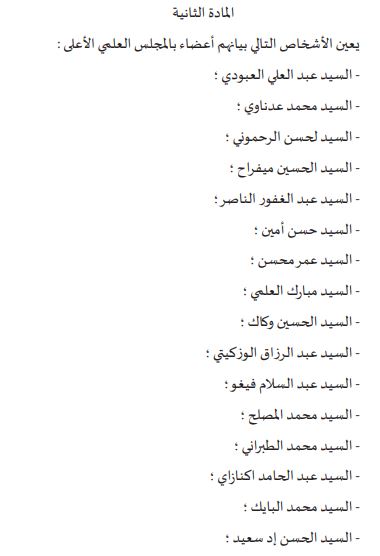 وجاءت لائحة أعضاء المجلس العلمي الأعلى الجدد المعينين على الشكل الآتي: عبد العلي العبودي؛ محمد عدناوي؛ لحسن الرحموني؛ الحسين ميفراح؛ عبد الغفور الناصر؛ حسن أمين؛ عمر محسن؛ مبارك العلمي؛الحسين وكاك؛ عبد الرزاق الوزكيتي؛ عبد السالم فيغو؛ محمد املصلح؛ محمد الطبراني؛ عبد الحامد اكنازاي؛محمد البايك؛ الحسن إد سعيد؛ عبد السالم الزعر؛ وداد العيدوني؛ ناجية أقجوج؛ سعاد رحائم؛ خديجة بنهمو؛ زهراء ناجية الزهراوي.