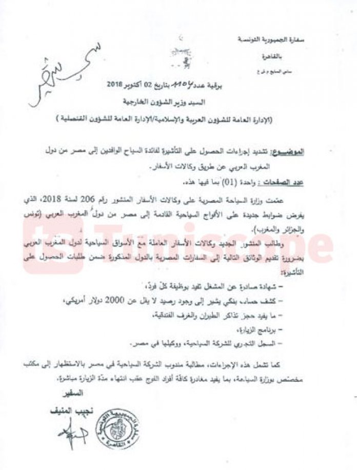 ونشرت السفارة التونسية المراسلة المذكورة، وقالت أنها عممتها على وكالات الأسفار، تخبر المواطنين من خلالها بضرورة توفر من يرغب بزيرة مصر، على وثيقة حساب بنكي تحتوي على رصيد بقيمة 2000 دولار، وشهادة صادرة عن المشغل توضح وظيفة كل زائر، و حجز تذاكر الطيران و الفندق، بالإضافة الى برنامج الزيارة.