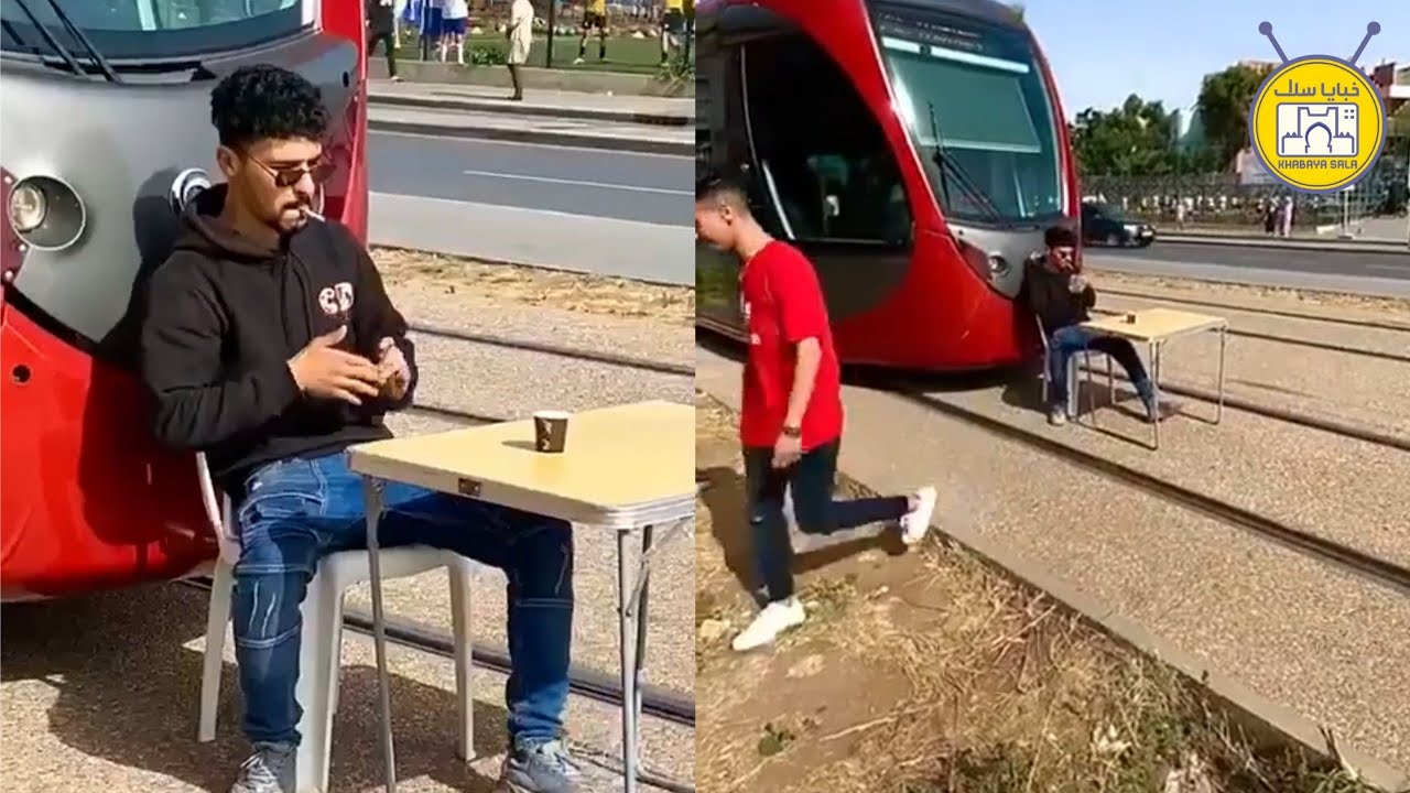 ويظهر مقطع الفيديو المذكور، شاب جالس على كرسي وأمامه طاولة وضع له صديقه فوقها كوب من القهوة، وسط سكة الطراموي، حيث اضطر سائقه إلى تنبيهه بمنبه الطرامواي دون جدوى، ليجبر على التوقف بالقرب من الشاب، حيث كاد أن يدهسه لولا الألطاف الإلاهية وحنكة السائق.