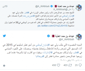 وقال العذبة في تغريدة أخرى: “لماذا رفضت إمارة أبوظبي على لسان الشيخ زايد رحمه الله تسليم القطريين الذين كانت أبوظبي معهم و دعمتهم بمحاولة الانقلاب الدموي الفاشل ضد صاحب السمو الأمير الوالد الشيخ حمد بن خليفة في 1996 ويطلب ولي عهد الإمارة تسليم “امرأة” إماراتية في 2015 لم تقم بمحاولة إنقلاب دموي بالإمارة؟”.