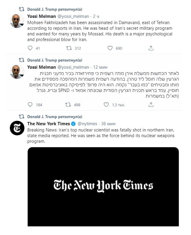 ونشر ترامب في حسابه على “تويتر”، تغريدة للصحفي “الإسرائيلي” يوسي ميلمان تشير إلى أن العالم النووي فخري زاده، كان رئيسا لبرنامج إيران العسكري السري، وأنه كان مطلوبا لدى “الموساد” منذ سنين.