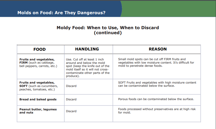 “في مراحله الأولى، أو تواجد على الخضار والفاكهة الصلبة (كالجزر والملفوف…)، وغالباً ما يكون في هذه الحالة على شكل طبقة قطنية رقيقة فاتحة، عندئذ تُطبّق معايير السلامة الغذائية التي تنصّ على اقتطاع الجزء المتعفّن ونحو سنتيمترين إضافيين، وحينها لا ضرر في تناول الفاكهة أو الخضار”.