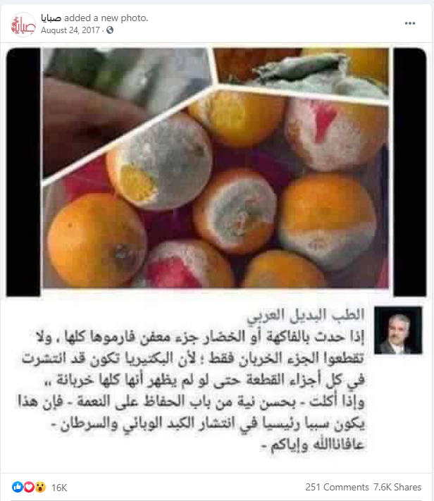 يتداول مستخدمون لمواقع التواصل الاجتماعي منشوراً يحذّر من تناول الخضار والفاكهة في حال أصاب العفن جزءاً منها، وينصح بالتخلّص منها لأنها من الأسباب الرئيسية لأمراض السرطان.