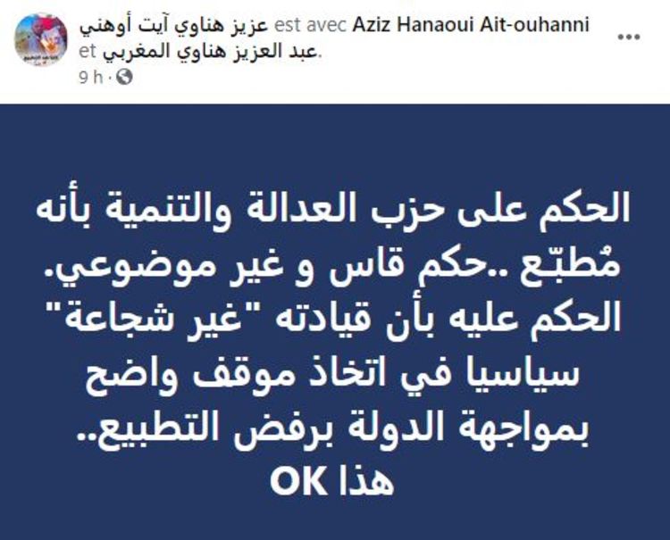 وقال هناوي في هذا الصدد، “أن الحكم على حزب العدالة والتنمية بأنه مُطبّـع ..حكم قاس و غير موضوعي”. مضيفا، “الحكم عليه بأن قيادته “غير شجاعة” سياسيا في اتخاذ موقف واضح بمواجهة الدولة برفض التطبيع، هذا صحيح”. بينما قال عبد اللطيف سودو، “الاعتدال في المواقف، لا للتخوين و لا للتبرير”.