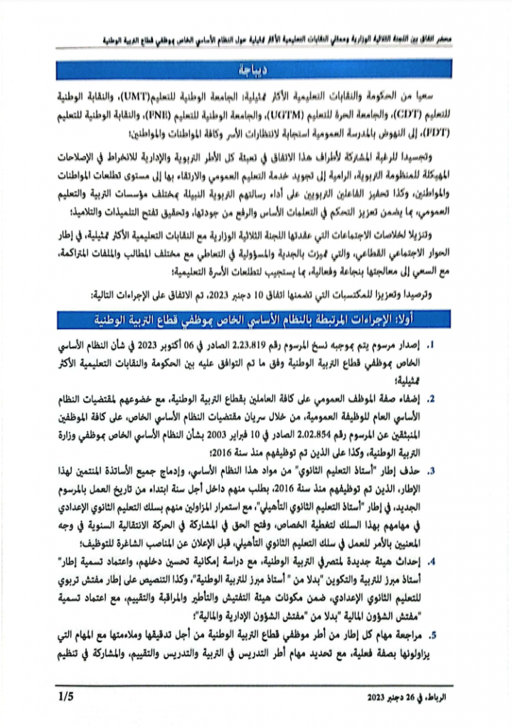 الخاص بموظفي قطاع التربية الوطنية وفق ما تم التوافق عليه بين الحكومة والنقابات التعليمية الأكثر تمثيلية”
