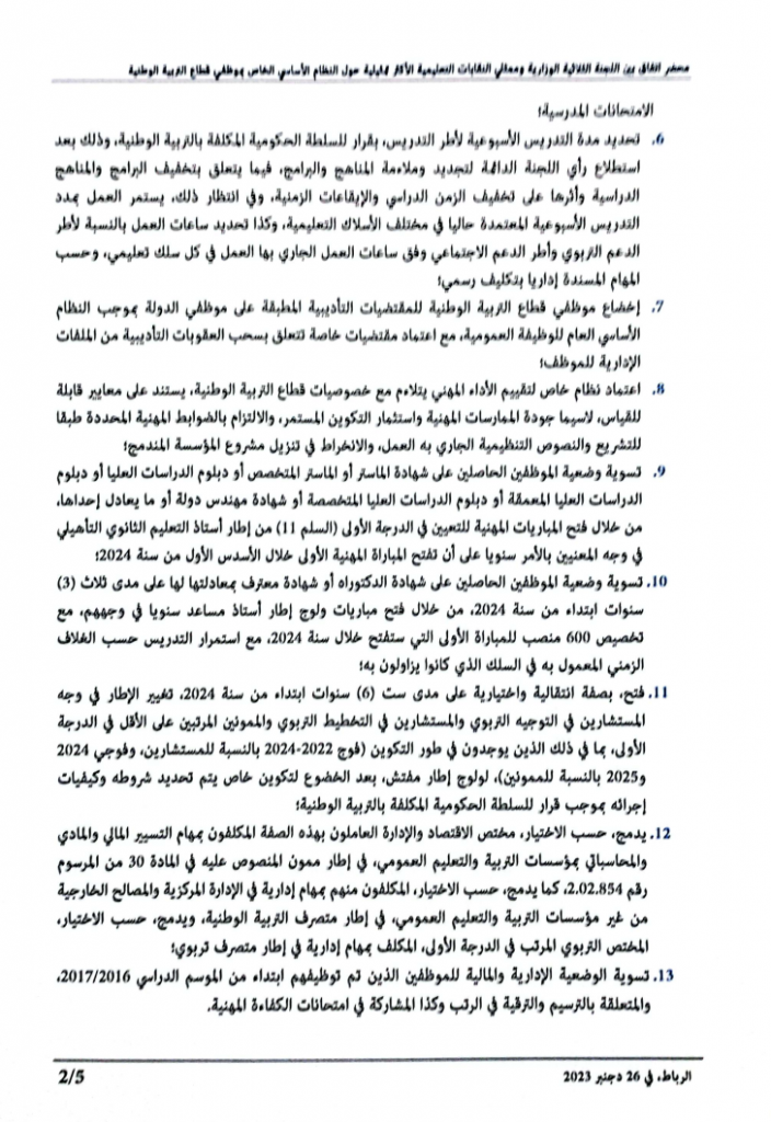 وتضمن المحضر أيضا “تسوية وضعية الموظفين الحاصلين على شهادة الماستر أو الماستر المتخصص أو دبلوم الدراسات العليا أو دبلوم الدراسات العليا المعمقة أو دبلوم الدراسات العليا المتخصصة أو شهادة مهندس دولة أو ما يعادل إحداها، من خلال فتح المباريات المهنية للتعيين في الدرجة الأولى (السلم 11) من إطار أستاذ التعليم الثانوي التأهيلي في وجه المعنيين بالأمر سنويا على أن تفتح المباراة المهنية الأولى خلال الأسدس الأول من سنة 2024”.