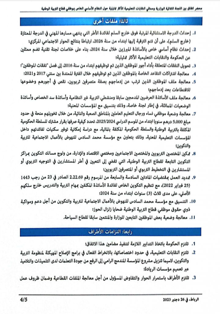 وذلك بشكل اختياري”. حيث “تلتزم الحكومة بالنظر في تحسين دخل أساتذة التعليم الابتدائي والثانوي الإعدادي وإطار المختص التربوي وإطار المختص الاجتماعي بنص تنظيمي لاحق”.