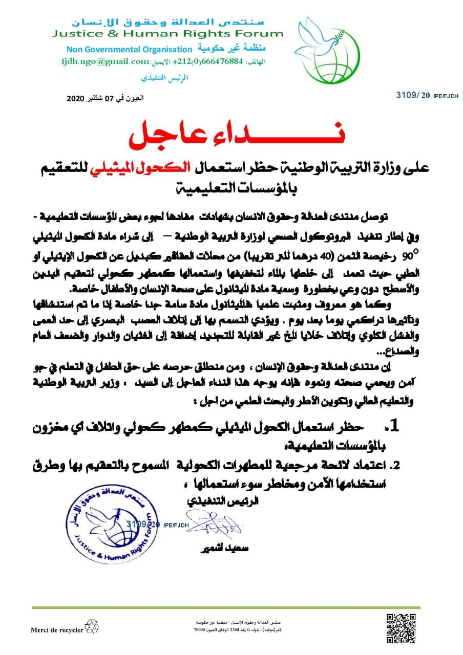 وجه منتدى العدالة وحقوق الإنسان نداء عاجلا لوزارة التربية الوطنية بخصوص استعمال الكحول الميثيلي للتعقيم بالمؤسسات التعليمية.