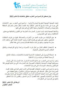 وخلص البيان إلى مطالبة السلطات العمومية بإتاحة معلومات شاملة عن الانتخابات للجمهور، إنفاذا للفصل 27 من الدستور، والقانون 13-31 المتعلق بالحق في الوصول الى المعلومات.