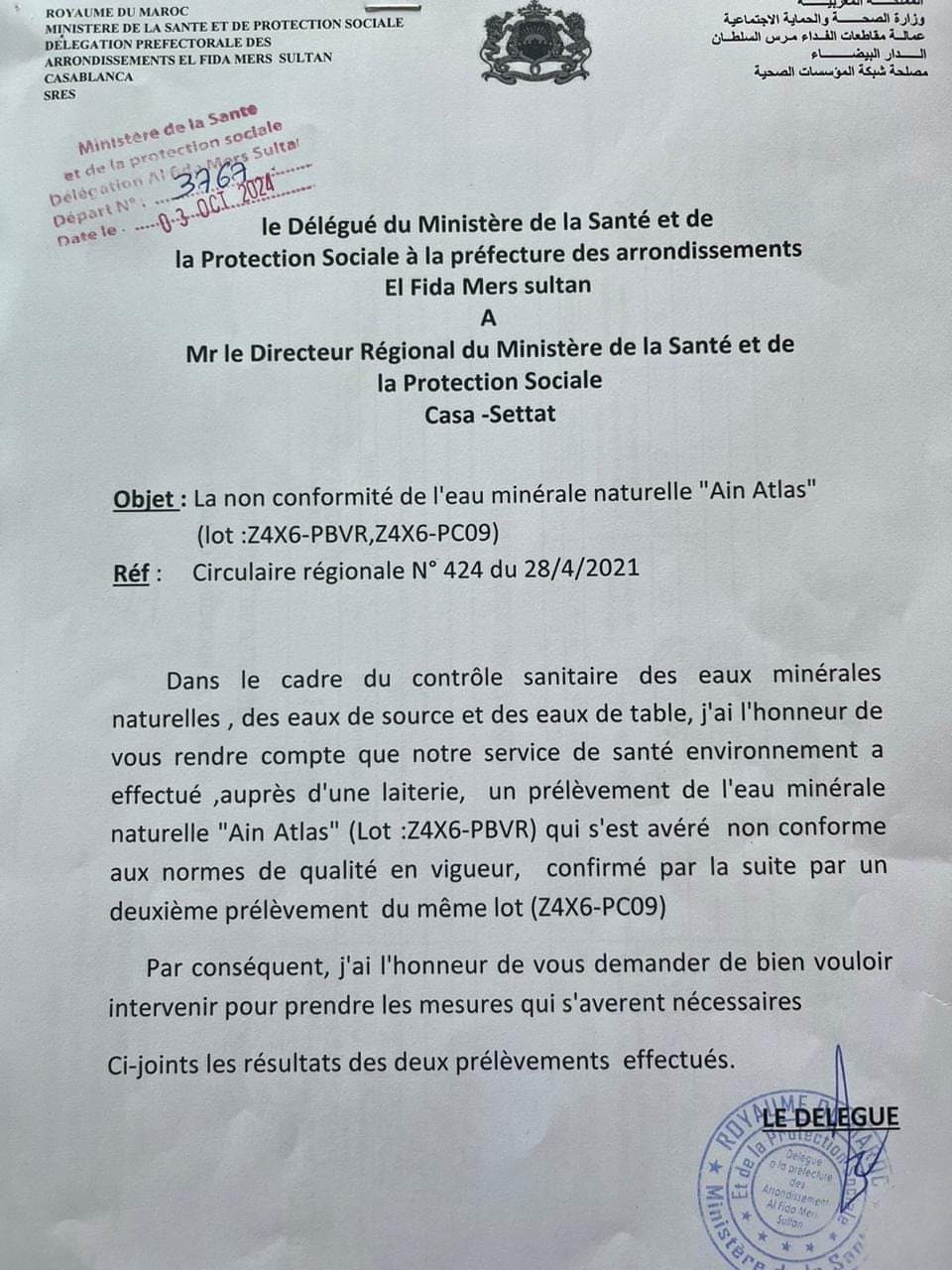 وشدد ذات المصدر على أن المعلومات التي تحتوي عليها الوثيقة المتداولة على مواقع التواصل الاجتماعي بخصوص عدم مطابقة المياه المعدنية الطبيعية لشركة “عين أطلس” للمعايير المعمول بها، ليست صحيحة ولا أساس لها من الصحة.