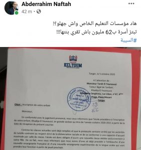 وثيقة من مدرسة خاصة تطلب من أب أداء 62 مليون سنتيم مقابل تسجيله لإبنته واستياء واسع على صفحات التواصل الإجتماعي