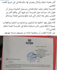 وفي ردّها، قالت المؤسسة الخصوصية أن قرارها يرجع لإمتلاء الأقسام وظروف الطوارئ الصحية الذي تمر بها البلاد وأنها ستقوم بإحداث فصل دراسي جديد يخصص للطفلة المعنية لوحدها مع توظيف مدرسة للسهر على تدريسها مطالبة الأب بأداء 62 ألف درهم شهريا أي ما يعادل 62 مليون سنتيم لمدة 10 أشهر أي موسم دراسي كامل.