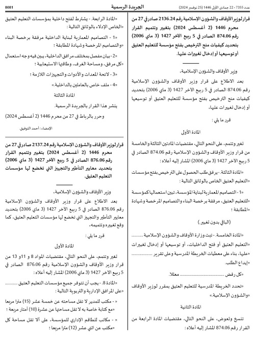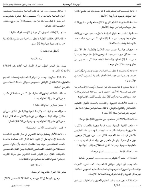 وتضمنت الجريدة الرسمية قرارا آخر للوزير أحمد التوفيق شدد على أن جميع مؤسسات التعليم العتيق يجب أن تتوفر على مرافق إدارية، منها مكتب للمدير لا تقل مساحته عن 15 مترا مربعا، مع كتابة خاصة به لا تقل مساحتها عن 10 أمتار مربعة، وكذا مكاتب للطاقم الإداري للمؤسسة لا تقل مساحة كل مكتب منها عن 12 مترا مربعا، هذا بالإضافة إلى قاعة للمستندات والمحفوظات لا تقل مساحتها عن 20 مترا مربعا وعرضها عن 4 أمتار.