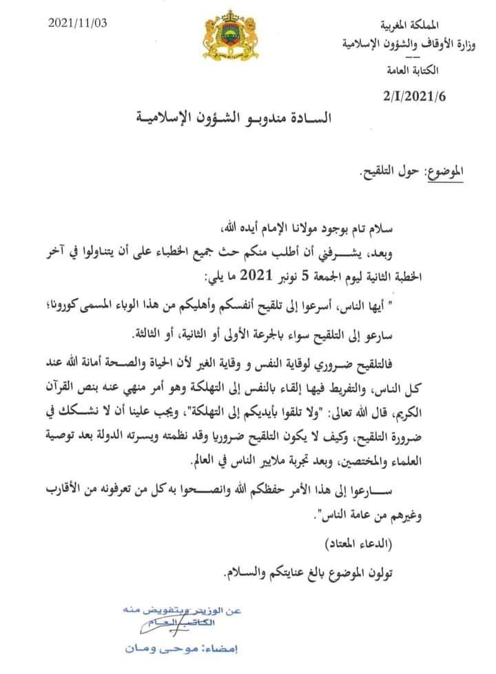 وجه الكاتب العام لوزارة الأوقاف مذكرة مخاطبا فيها مندوبي الشؤون الإسلامية على أن يطلبوا من الخطباء الحديث عن ضرورة التوجه إلى مراكز التلقيح، وعدم التشكيك في التلقيح، لأن الحياة والصحة أمانة الله عند الناس، فلابد من التلقيح لحماية النفس والغير، وعدم التفريط فيها إلقاء بالنفس إلى التهلكة.
