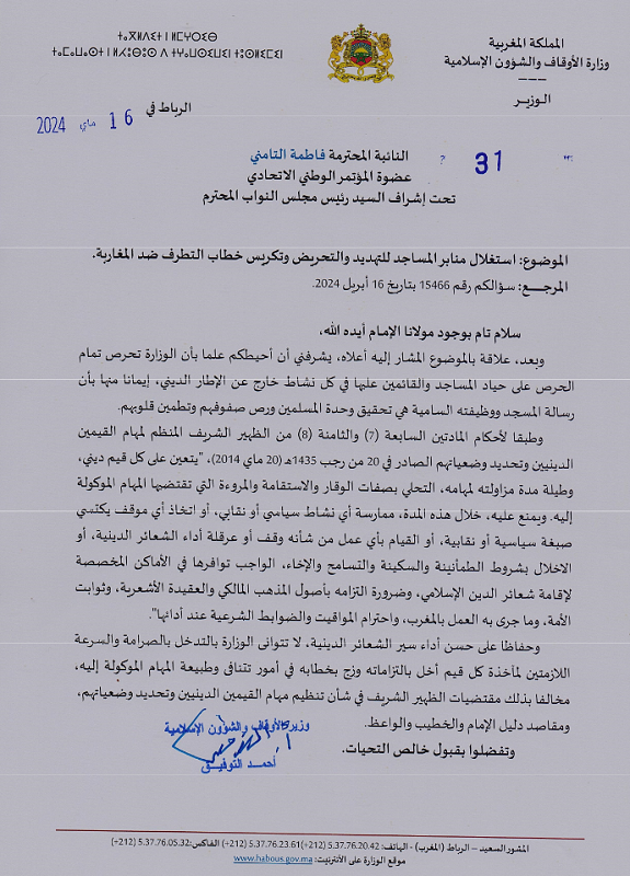 ردت وزارة الأوقاف والشؤون الإسلامية، على النائبة البرلمانية، فاطمة التامني، التي سبق واتهمت خطباء باستغلال منابر المساجد للتحريض ونشر خطاب التطرف والكراهية.